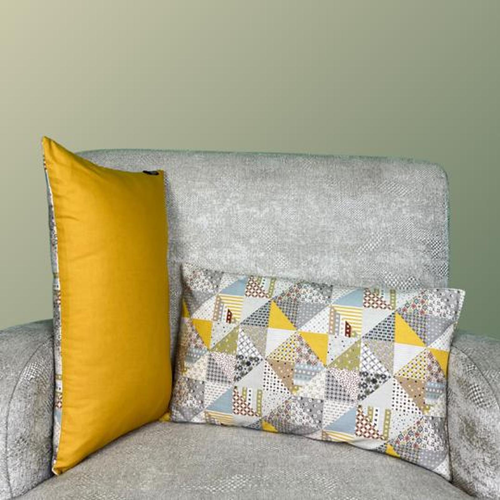Sementara itu, sisi belakang menggunakan kain katun poplin berwarna kuning elegan. Desain polos ini memberi pilihan tampilan yang lebih tenang dan minimalis. Jika Anda ingin suasana ruangan terlihat lebih sederhana, cukup balikkan sarung bantal ke sisi polosnya.