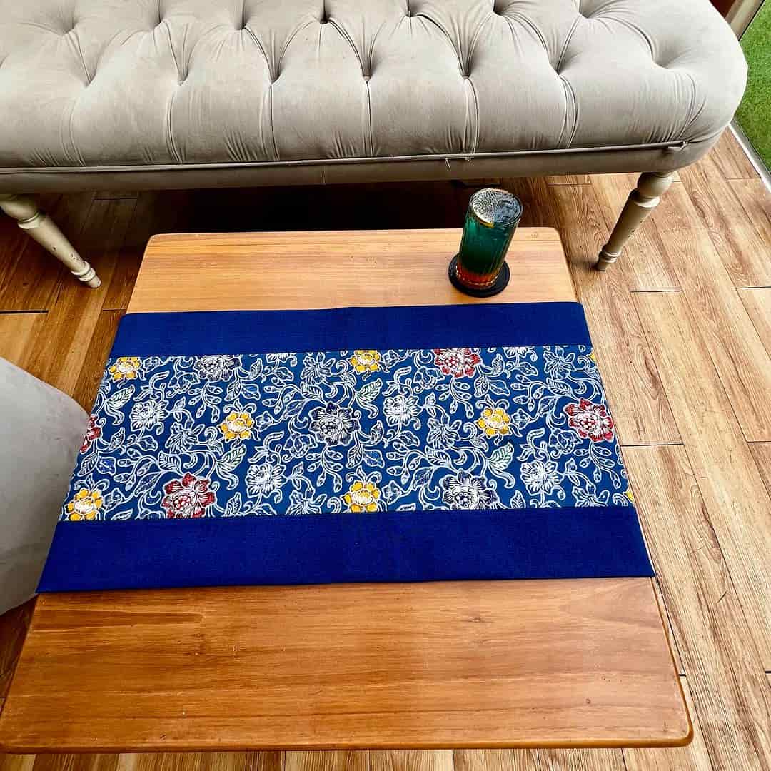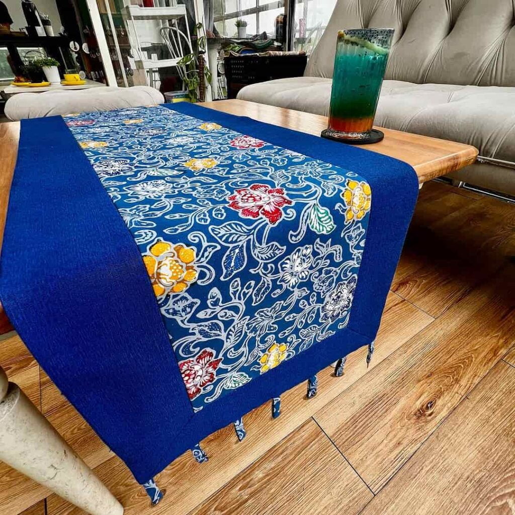Sisi atas table runner ini menampilkan kain batik khas Pekalongan berkualitas tinggi dengan motif bunga seruni yang menawan, diwarnai dengan nuansa biru yang hangat dan menenangkan.