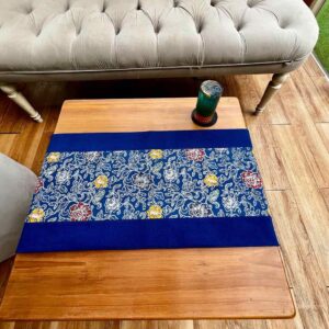 Sisi bawah runner dibuat dari kain tenun polos berwarna biru, menawarkan pilihan gaya yang lebih sederhana namun tetap menarik. Cocok untuk saat Anda menginginkan tampilan yang lebih minimalis atau untuk menyelaraskan dengan dekorasi ruangan yang lebih berwarna.