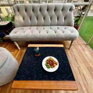 Sisi atas table runner ini menampilkan motif gerimis warna hitam yang memikat. Sementara itu, sisi bawah dibuat dari kain tenun polos warna abu-abu, memberikan pilihan desain yang lebih tenang dan serasi untuk suasana yang berbeda.