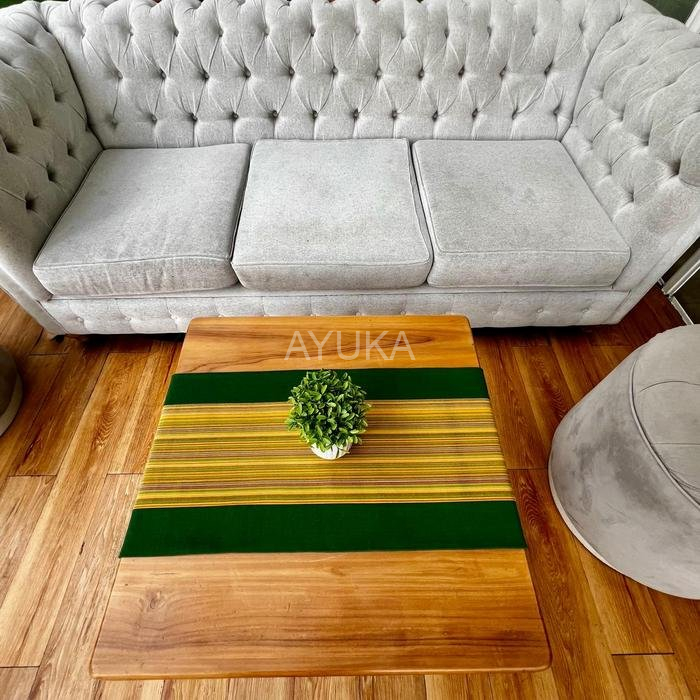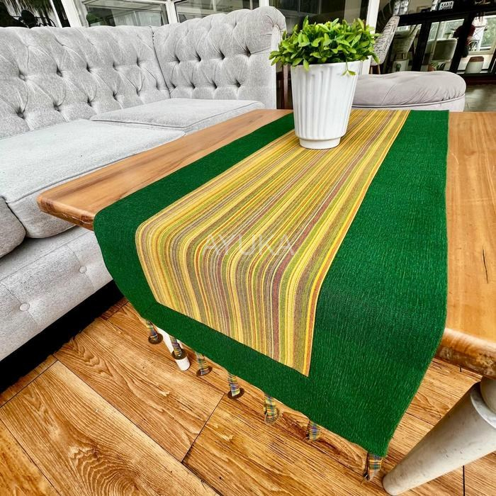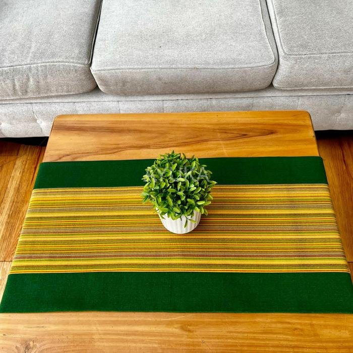Pada sisi atas, table runner menampilkan motif lurik bernuansa kuning yang dipadukan dengan kain tenun polos berwarna hijau. Kombinasi warna ini menciptakan tampilan yang cerah namun tetap elegan.
